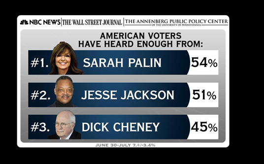 And at the top of the list? Former vice presidential candidate Sarah Palin: 54% of American voters have absolutely heard enough from the Alaska native.