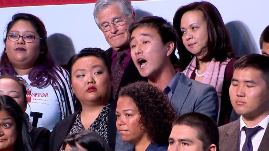 So you can understand if he was a bit annoyed when, towards the end of his speech in San Francisco’s Chinatown, pro-immigration activists started heckling.