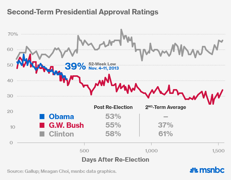 If Obama manages to fix the website, secure some kind of solution for cancelled plans, and then generally stay out of trouble, he should improve on that performance.
