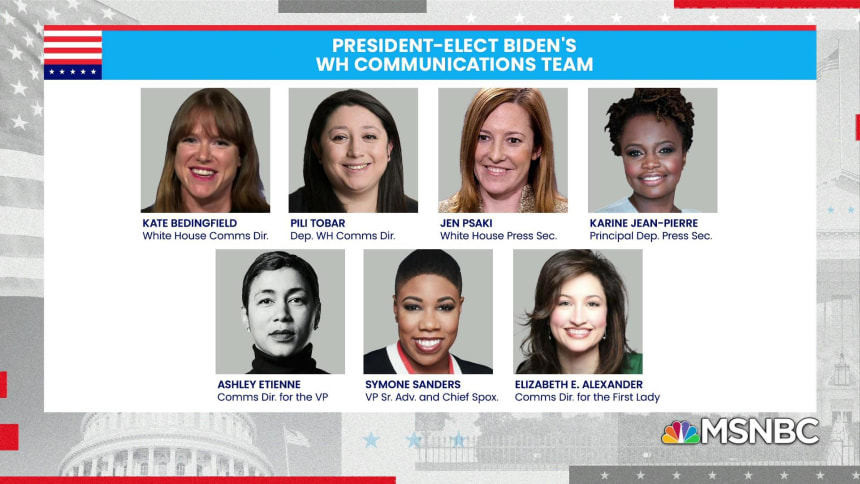 “In my years working for President-elect Biden, he has always been a champion for the women on his team, empowering us and respecting our voices,” Bedingfield told Brzezinski on Tuesday. “So, while it is historic, in many ways it comes as no surprise at all to me that he has chosen a team of women to lead White House communications, because it is exactly in keeping with his belief that he should hear from diverse perspectives as he makes any key decisions.”