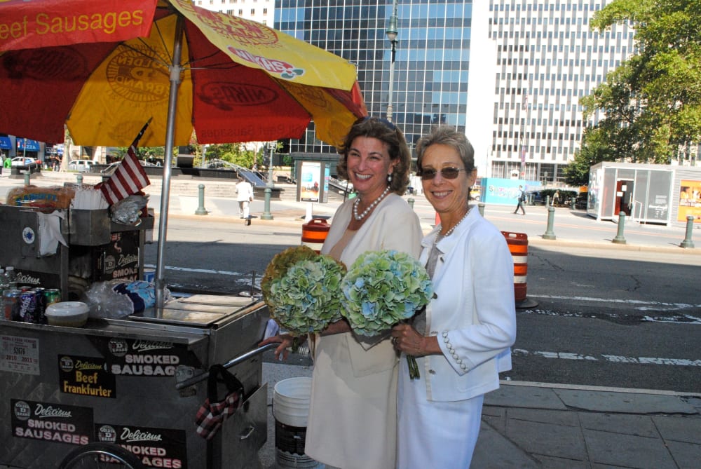 2) Share your story. I keep a photo on my desk of Robin and me on our wedding day. We’re in white dresses, at the hot dog stand in front of City Hall. It’s a window into the way we live. Casual and civic-minded.