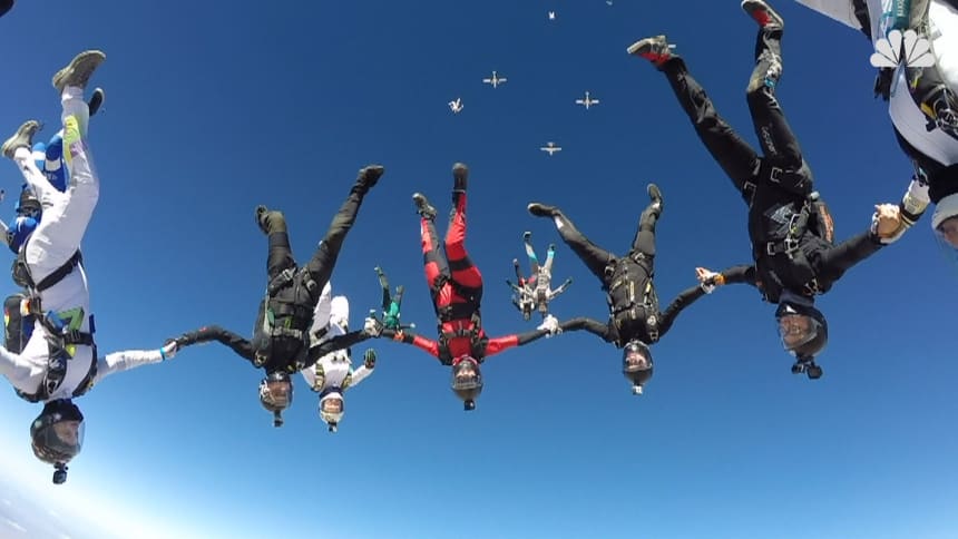 Curtis: To achieve the record formation, we had to strategically fly to predetermined slots and hold hands – falling at 160 miles per hour for only 80 seconds – in a head-to-earth orientation with critical balance and skill.
