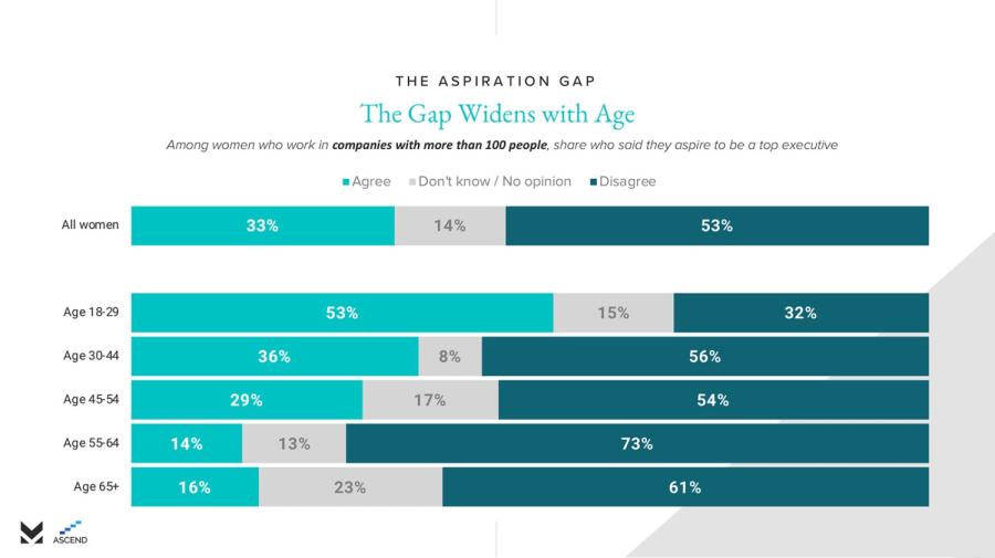 The aspiration gap gets worse with age, according to the results. Among women between the ages 18 and 29, 53 percent aspire for a leadership role. This percentage drops drastically for women ages 30 through 44, which only boasts 36 percent of women interested in leadership positions. By the time women are ages 55-64, only 14 percent have leadership aspirations.