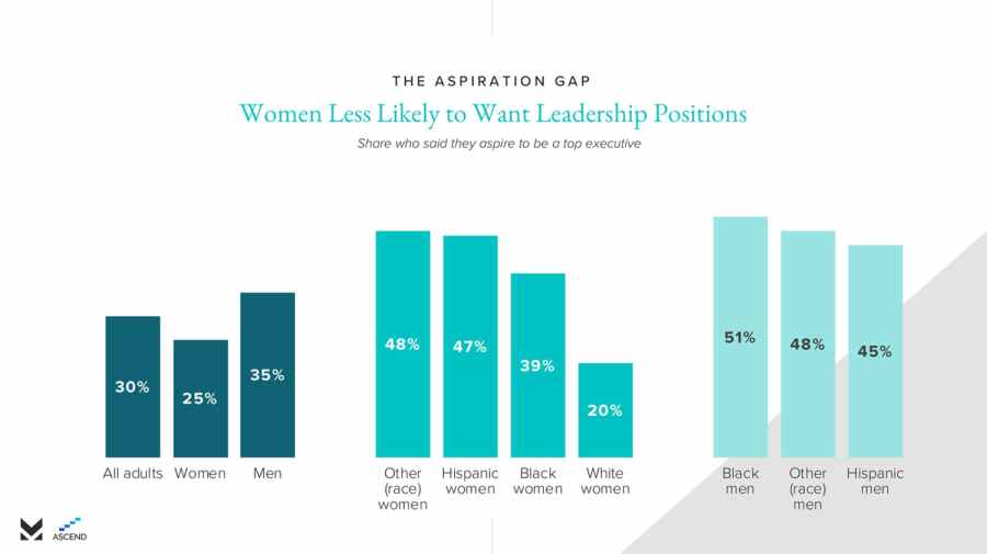 Overall, women still lag behind men in leadership aspirations by 10 percent. Interestingly, however, minority women aspire for leadership positions at a much higher rate than white women. Only 20 percent of leadership-seeking women are white, while 39 percent are black, 47 percent are Hispanic, and 48 percent are other races.