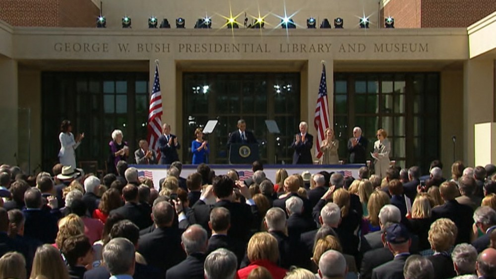 Presidential moment for Obama as Syrian intelligence collides with Bush library dedication