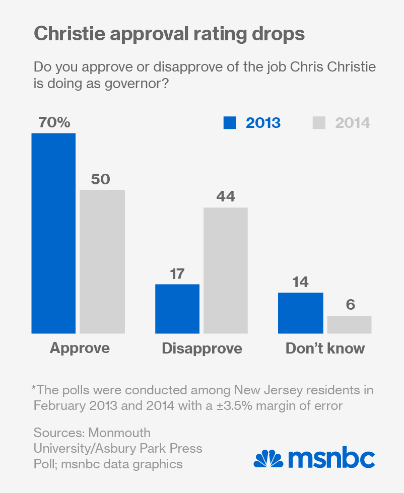 Since the scandal came to light, Christie’s approval rating has fallen 20 points to 49% among registered New Jersey voters and 50% of all New Jerseyans, according to the latest Monmouth University/Asbury Park Press poll. Even more detrimental, just 45% gave the governor an above-average grade on the Sandy recovery — a big drop from five months ago when 72% ranked the governor above average on the recovery.