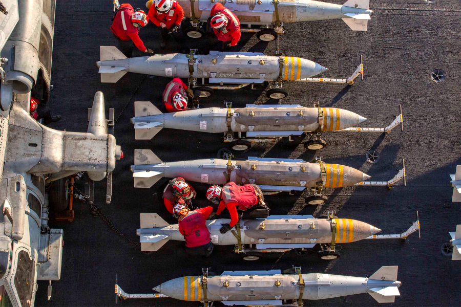 In an overhead image provided by the U.S. Navy, U.S. sailors prepare ordinance from the flight deck of the USS Abraham Lincoln in support of Operation Epic Fury.