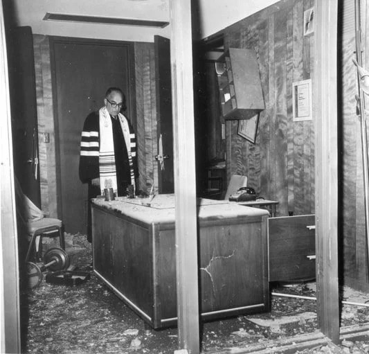 Rabbi Perry Nussbaum surveys damage at Beth Israel Congregation following the bombing on Sept. 18, 1967.