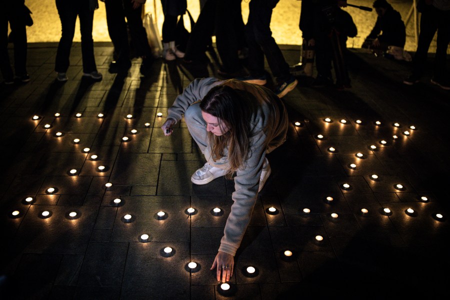 An Israeli arranges nightlights in the form of the Star of David during a candlelight vigil hours after two gunmen shot and killed people gathered on Australia’s Bondi beach for the Jewish festival of Hanukkah, in Tel Aviv on December 14, 2025.