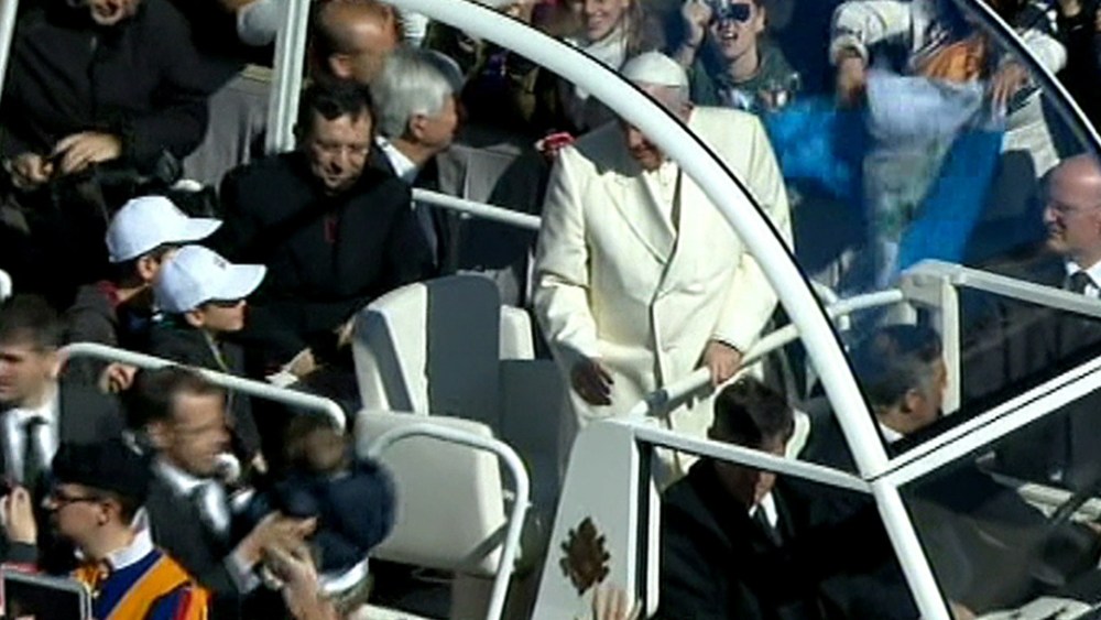 Two kids grab a ride on the pope mobile