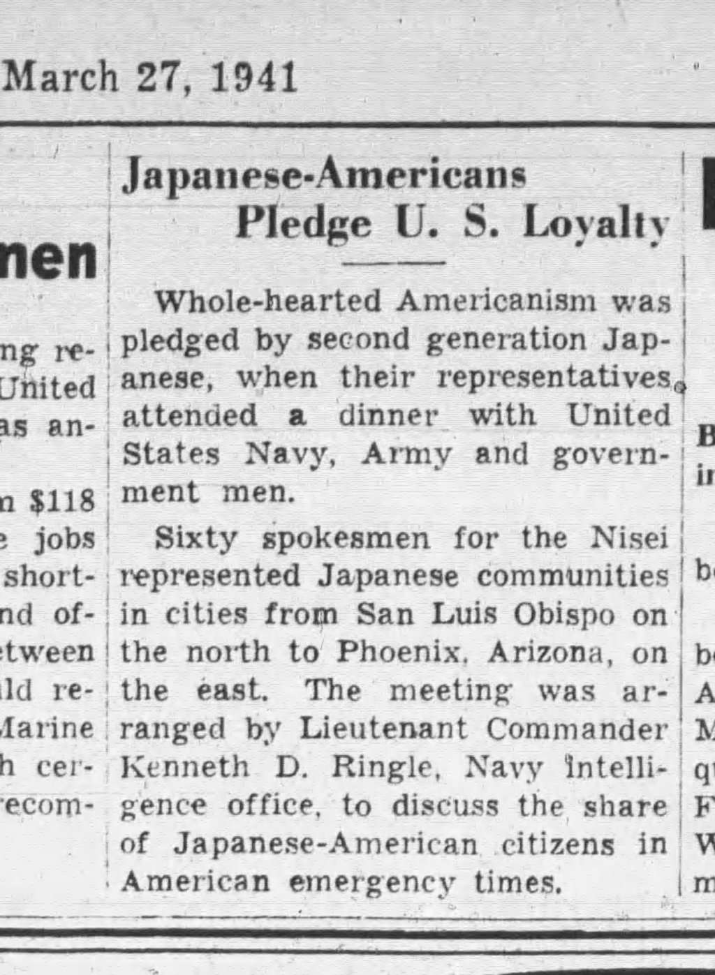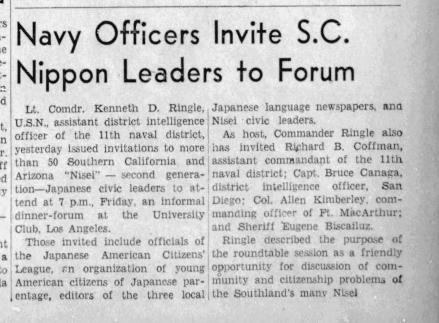 Japanese Americans in California and Arizona pledge “whole-hearted Americanism” after a 1941 meeting with Navy Lt. Cmdr. Ken Ringle, months before Pearl Harbor