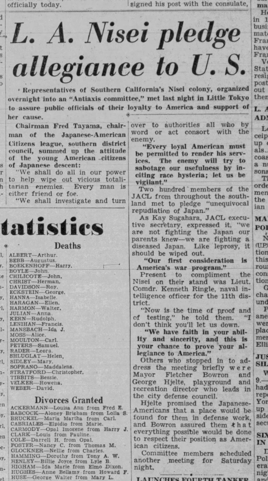 Japanese Americans in Los Angeles pledge public allegiance to the United States, after the attack on Pearl Habor. Navy Lt. Cmdr. Ken Ringle tells them, “we have faith in your ability and sincerity.”