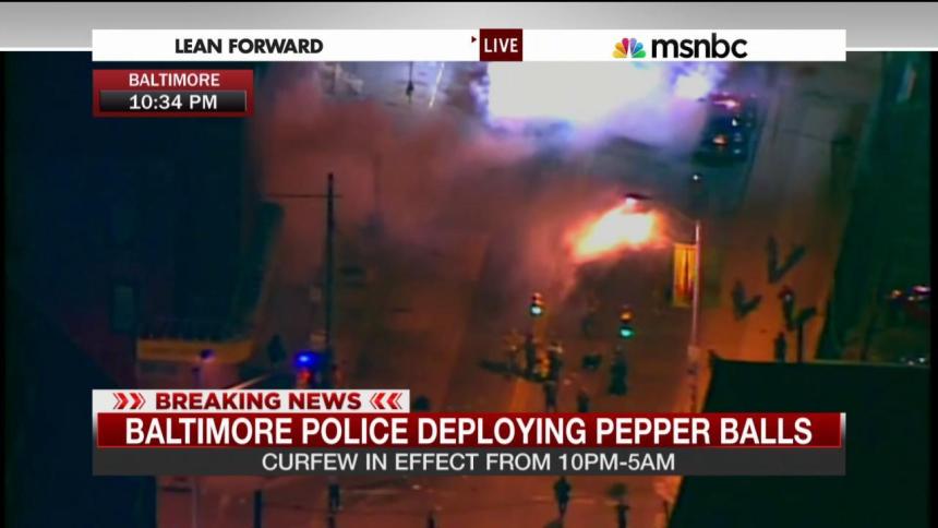 About an hour before the enactment of the curfew, Baltimore police officers in cars and helicopters announced via loudspeakers that they would enforce the citywide curfew. Baltimore also activated its reverse 911 system to make the announcement to residents via land-line telephones, Police Captain Eric Kowalczyk said during a press briefing on Tuesday night. Msnbc’s Rachel Maddow pointed out that those calls would be reaching people already at home — presumably the wrong audience.