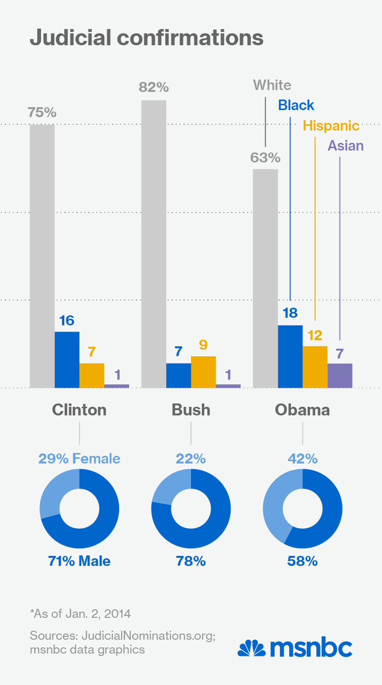 The potential implications for the federal judiciary are dramatic. While skin color is by no means a predictor of an individual’s legal or political views, studies have shown that have a woman or black judge on the bench can shift the outcome of cases dealing with matters like discrimination and voting rights. In 2009, according the Brookings Institution, only 20% of federal judges were women, 6% were black and 5% were Hispanic.