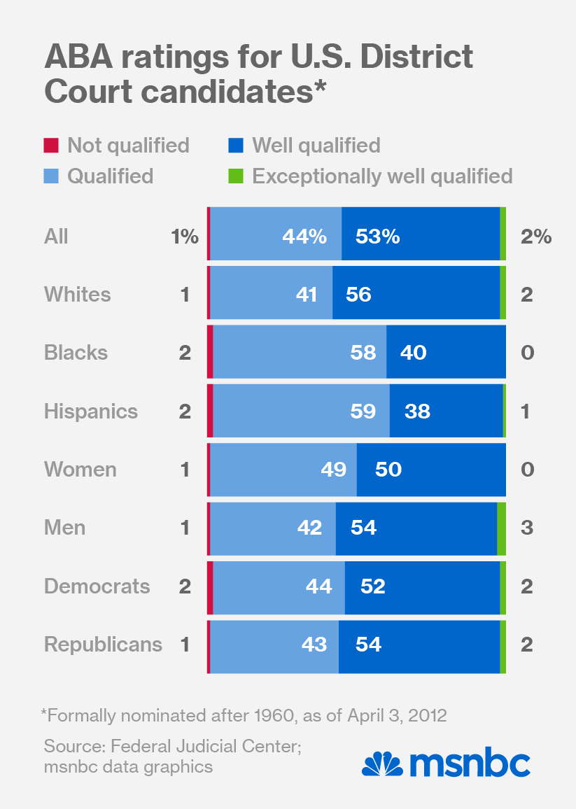 The Obama administration, which has nominated the most diverse slate of judges ever, has sometimes found itself struggling to confirm its nominees who have received low ratings from the ABA. The Democratic Party has more financial and political links to the legal profession, so those complaints have often only been discussed quietly — as an industry, lawyers were the biggest donors to Obama’s 2012 presidential campaign.
