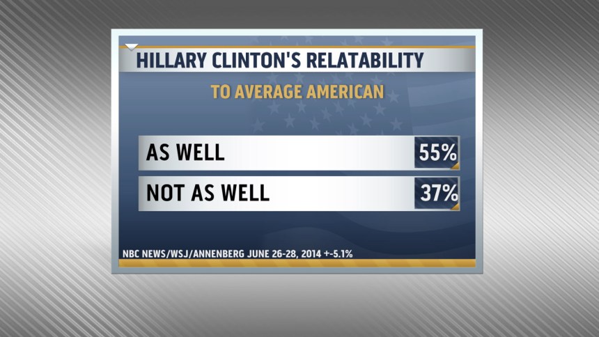 Fifty-five percent of Americans say that Hillary Clinton — widely considered the 2016 Democratic presidential front-runner — can relate to and understand the problems of average citizens as well as other presidential candidates can, according to a new NBC News/Wall Street Journal/Annenberg poll.