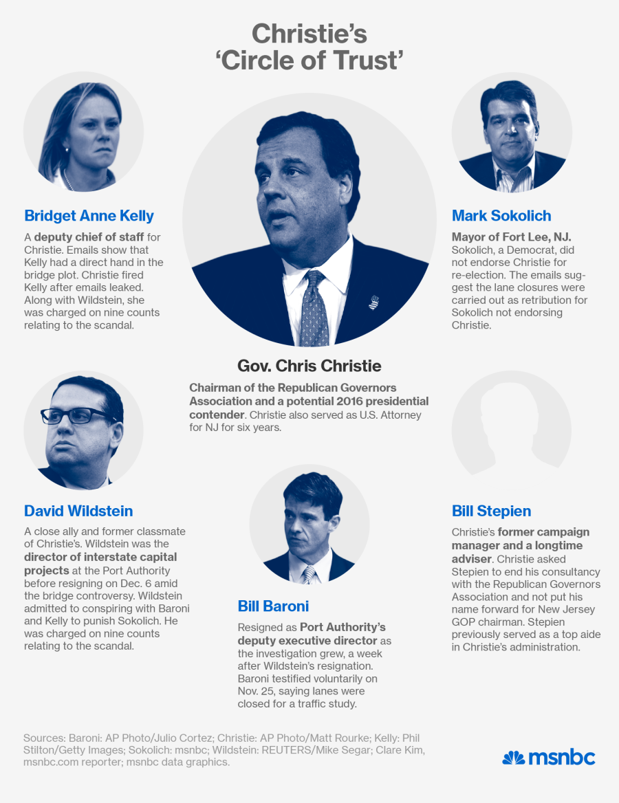 Christie, in a muscular statement, refuted any and all allegations that he was somehow complicit in the scandal. “Today’s charges make clear that what I’ve said from day one is true,” said the governor, who was in Virginia for an event with his political action committee. He added, “I had no knowledge or involvement in the planning or execution of this act. The moment I first learned of this unacceptable behavior I took action, firing staff believed to be accountable, calling for an outside investigation and agreeing to fully cooperate with all appropriate investigations, which I have done. Now 15 months later it is time to let the justice system do its job.”