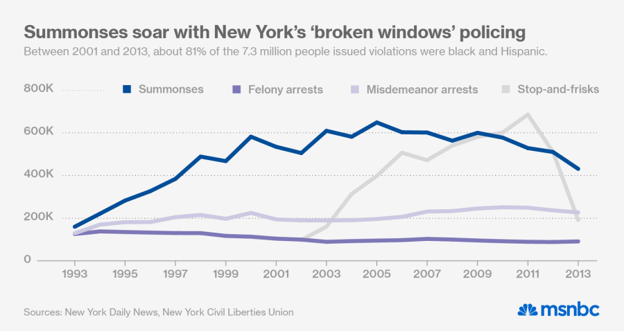 According to the NYCLU report and an analysis by the New York Daily News, 81% of the 7.3 million people slapped with low-level summonses between 2001 and 2013 were black and Hispanic. The data includes summonses spanning the whole of Michael Bloomberg’s mayoral term, a period when New York City ramped up an aggressive police campaign in poor, mostly minority communities. Critics of Broken Windows say that countless millions of dollars have been spent on targeting minority and low-income neighborhoods for petty crimes — even while crime by many measures is at an all-time low.