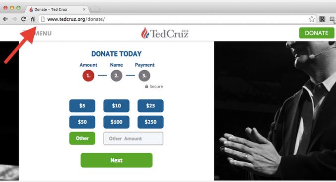 The more serious concern for Team Cruz to address is the question of online security. One big no-no in online fundraising is an un-secured donation page. As Vox illustrated, there was no padlock icon in the address bar of the donation page of tedcruz.org to indicate that the entire donation process online is SSL-protected 13 hours after the website had launched. (It was updated later in the day and fixed).