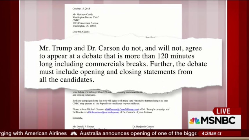 “Neither Mr. Trump or Dr. Carson will participate in your debate if it is longer than 120 minutes including commercials and does not include opening and closing statements,” the letter, obtained exclusively by NBC News and signed by both candidates, reads.