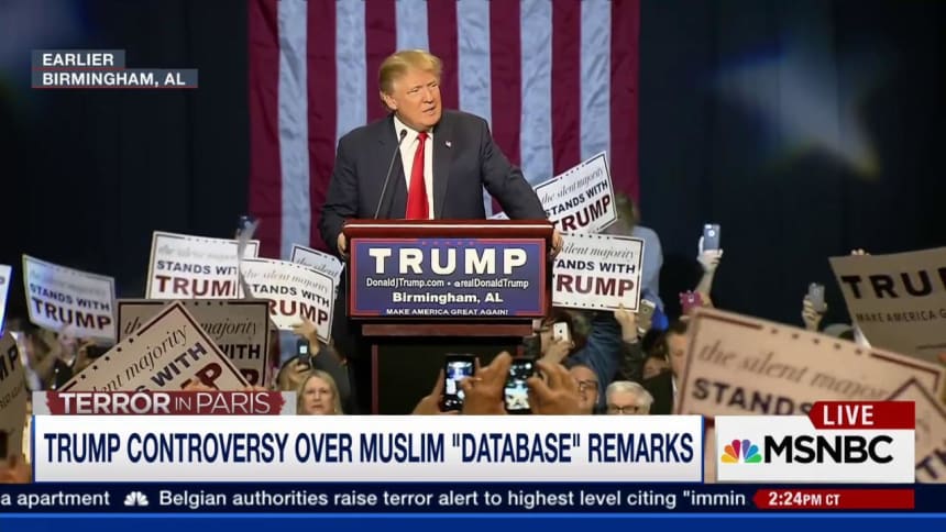 On Thursday evening, Trump faced questions from NBC News about creating a database system to track Muslims, which Trump said at the time he “would certainly implement.” On Friday, Trump attempted to distance himself from the comments, saying in a tweet, “I didn’t suggest a database-a reporter did.”