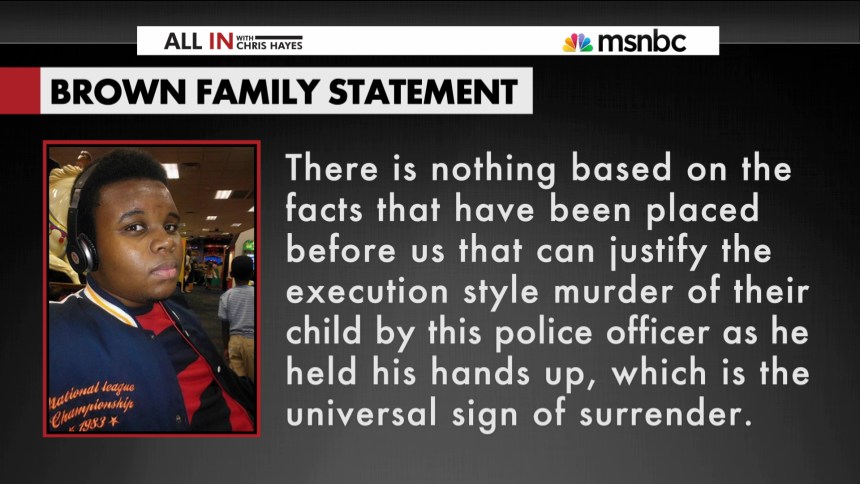 “We must always not lose sight of what happened here, that Michael Brown was killed execution style in the middle of Canfield on that dreadful day last Saturday,” said Daryl Parks, one of the family’s lawyers. “There’s a lot of other side things that are taking place that have nothing to do with his death at that very moment and what that officer did. So let’s not lose sight of that.”