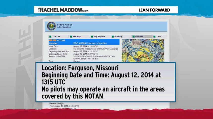 In August, the police told NBC News they weren’t trying to keep the press out with the flight ban. “We understand that that’s the perception that’s out there, but it truly is for the safety of pilots,” a police official said.