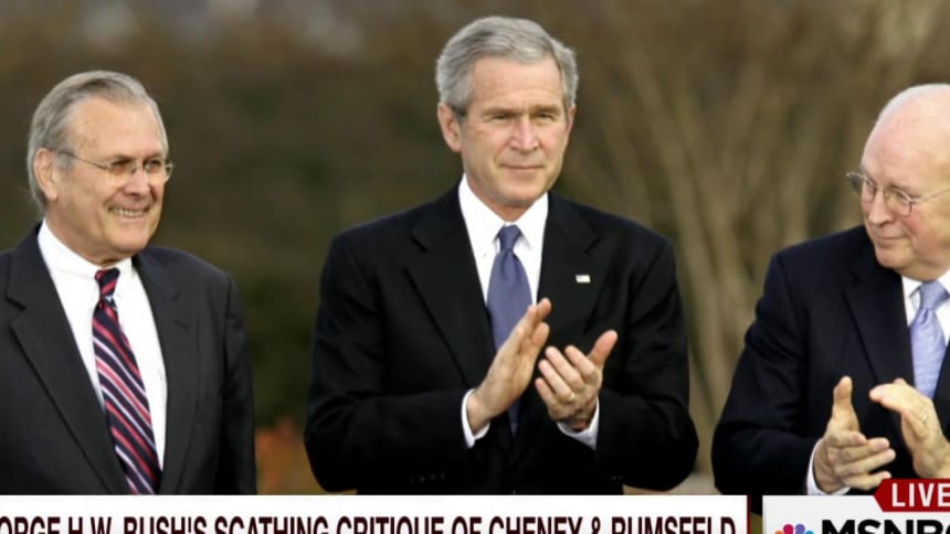 George W. Bush defended his former colleagues in a statement on Thursday. “I am proud to have served with Dick Cheney and Don Rumsfeld,” Bush said. “Dick Cheney did a superb job as vice president and I was fortunate to have him by my side throughout my presidency. Don Rumsfeld ably led the Pentagon and was an effective Secretary of Defense. I am grateful to both men for their good advice, selfless service to our country, and friendship.”