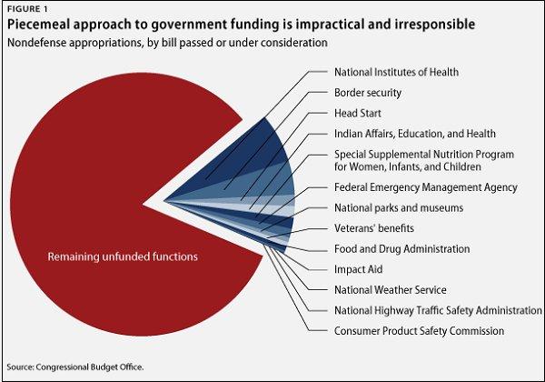 To date, the House has passed six piecemeal nondefense appropriations bills, with another eight on the docket for sometime this week or soon thereafter. Together, these 14 bills allocate approximately $83.1 billion in funding, for an average of just under $6 billion per bill. The total amount of nondefense funding in the original House-passed continuing resolution was $469.4 billion. Therefore, the House bills that either already passed or are currently under consideration make up less than 18 percent of the total. It would take another 65 bills, each with the average funding amount from the first 14 bills, to finish the job.