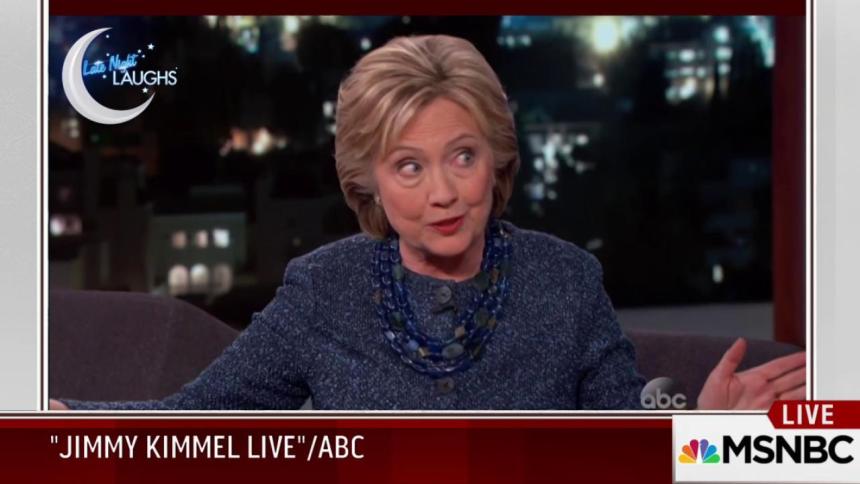 The former secretary of state simply laughed after Kimmel read her a litany of things Republican candidate Ben Carson has said recently. Pressed on her thoughts about them, she shrugged and said, “Well you know, we’ll just have to wait and see.”