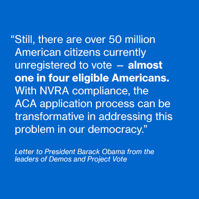 Because the ACA application doesn’t do enough, the groups wrote in a press release, “several million Americans already have lost out on the opportunity to register to vote.” They added: “Millions more will be denied this right if the administration does not take action in the coming months.”