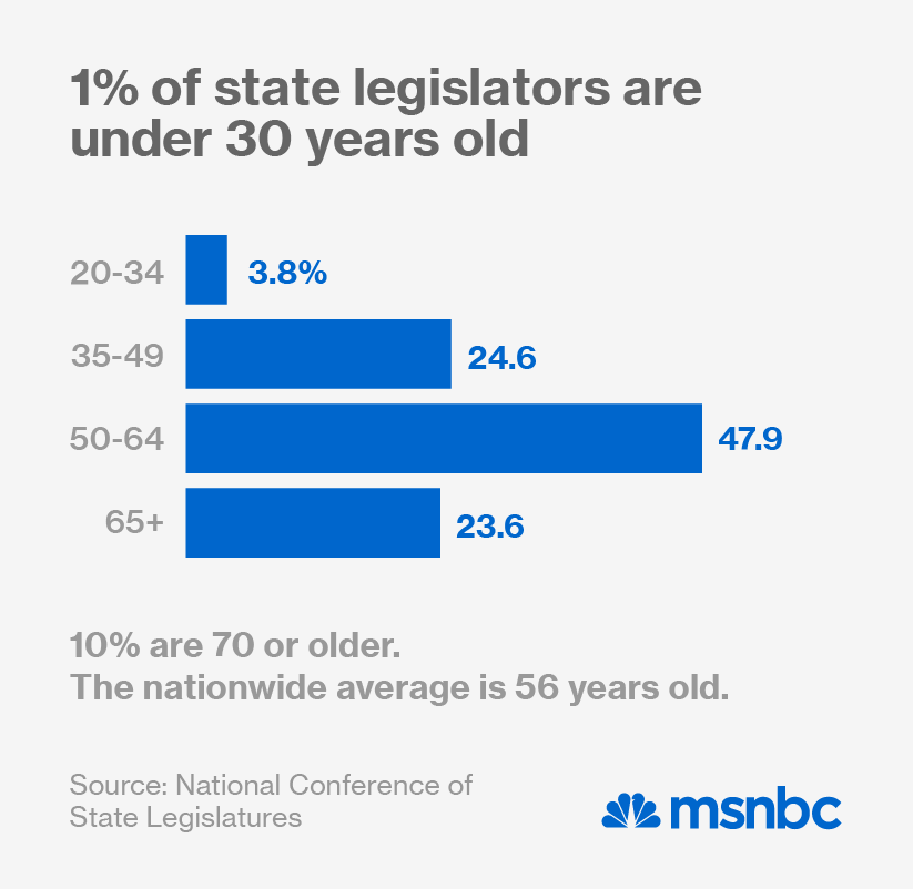 Launch Progress will have an uphill climb. According to the National Conference of State Legislatures, 3.8% of the 7,382 legislative seats across the country are held by people between the ages of 20 and 34. If you’re looking at state lawmakers under the age of 30, the percentage drops to 1%. The average age of a state legislator nationwide is 56 years old.