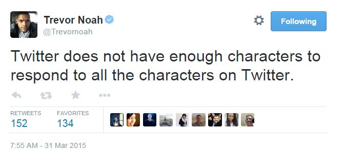 — Trevor Noah (@Trevornoah) March 31, 2015