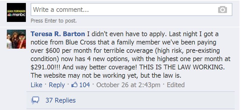 “I get it that ‘Obamacare’ won’t be good for everyone, maybe those covered under their employer’s group plan,” Jeff said. “But I’ve been waiting far too long for something like this that can give me a little peace of mind that I’m not financially screwed in the event of a catastrophic event like a car accident, heart attack, or whatever.”
