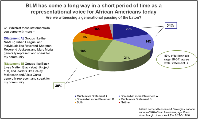 While there is, in general, a considerable amount of displeasure with the African-American community’s current leadership, our polling shows a community closely split: a slight 39 percent plurality of African-Americans agree that movements like BLM speak for and better represent their community, while 34 percent agree that the more traditional, iconic Civil Rights organizations, like the NAACP, represent the community. Unsurprisingly, this shift is being driven by millennials, with 47 percent of that age group identifying with BLM. BLM is now as legitimate a movement in the African-American community as the Tea Party is in the white electorate, if not more so.