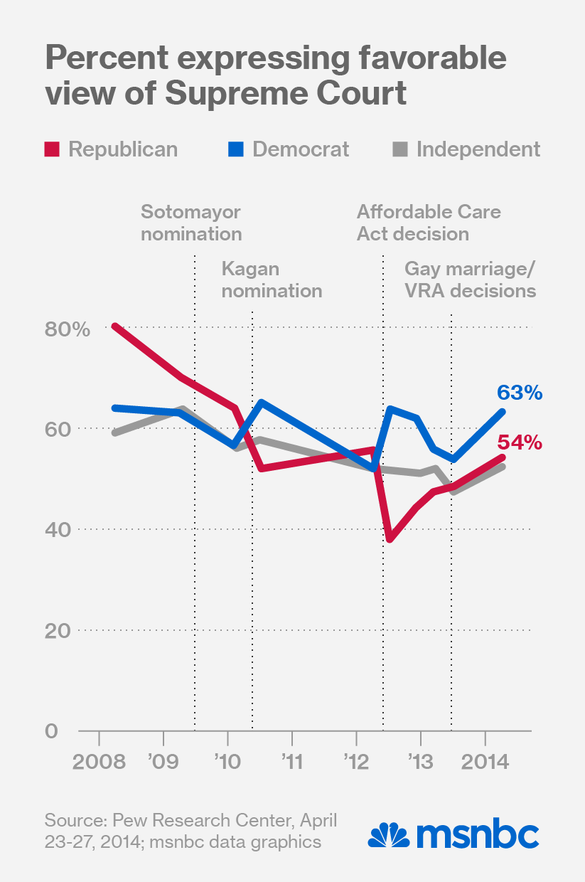 The poll results show just how unsuccessful Democrats have been in persuading their base that the Supreme Court has moved too far to the right. Despite decisions striking down school integration programs, rolling back the Voting Rights Act, and hindering the expansion of Medicaid in the Affordable Care Act, black Americans are even more likely to see the Roberts Court positively. Sixty-three percent of black Americans have a favorable view of the Roberts Court, up from 44% in the aftermath of its Voting Rights Act decision in July 2013.