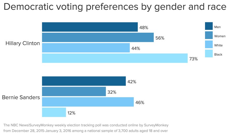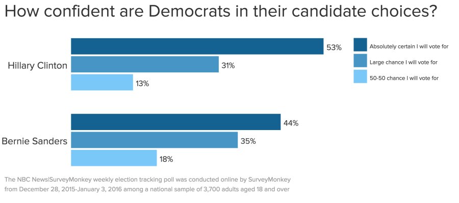 With the first Democratic primary now less than a month away, Hillary Clinton holds a significant lead over Bernie Sanders, according to the latest NBC News|SurveyMonkey Weekly Election Tracking Poll for the week of December 28, 2015 through January 3, 2016. Clinton leads Sanders by a 17-point margin—53 to 36—with only 2% of registered Democrat and Democratic-leaning voters supporting Martin O’Malley. The poll was conducted online among a national sample of 3,700 adults aged 18 and over.