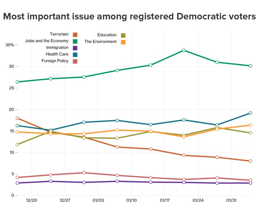 These percentages are in stark contrast to voters’ responses in mid-December, when 28 percent of voters thought terrorism was the most important issue, compared to 23 percent who listed the economy. The chart below graphs the weekly importance of issues between December 14 and February 7. Concerns about terrorism have declined steadily, while the importance of the economy has risen.