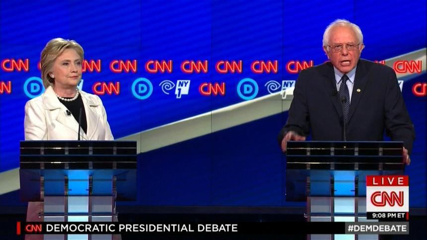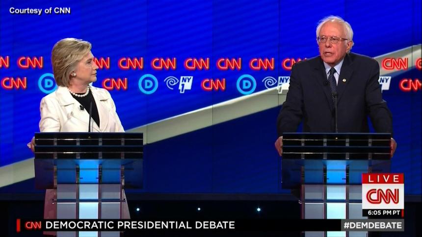 Bernie Sanders and Hillary Clinton are seen sparring on televisions in the reporters' filing room at the CNN Debate in Brooklyn, N.Y., April 14, 2016.