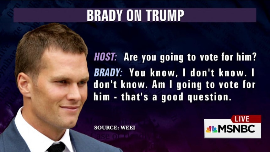 Brady, who entered this NFL season under a cloud of cheating accusations, has never officially aligned himself with a particular political party, although some speculated that his decision to skip a White House ceremony honoring the Patriots’ Super Bowl win earlier this year may have been politically motivated.