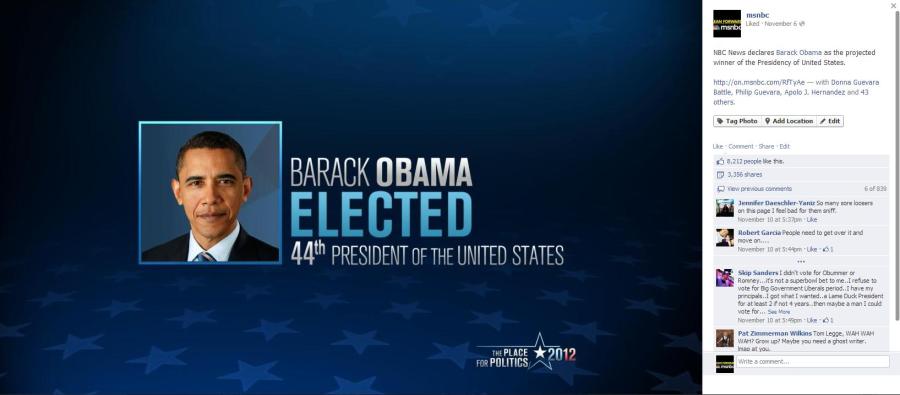 With more than 20 million related posts the election became the most tweeted about event in US political history. The msnbc community played its part in the celebration and the announcement below was shared more than 3,000 times– just one of thousands of images commemorating the moment across social media.