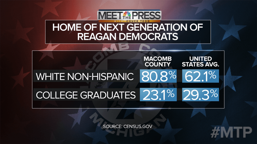 Those numbers match nicely with the demographic make-up of Macomb, which is less racially diverse than the country as a whole and has a lower percentage of college graduates.
