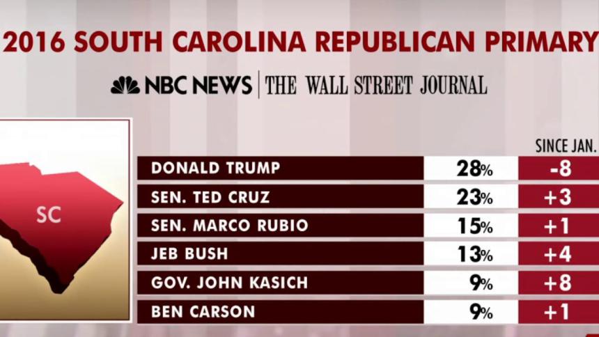 Donald Trump is now leading Saturday’s South Carolina Republican primary by 5 points – down from his 16-point lead in the state a month ago, according to results from a new NBC News/Wall Street Journal/Marist poll.