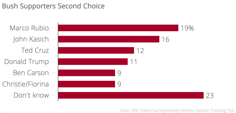 According to results of the NBC News|SurveyMonkey Weekly Election Tracking poll that was in the field between February 8 and February 14, and which interviewed 13,129 adults, we asked respondents who their second choice would be. By looking at the second choice for the 195 Bush supporters, we can get a very good indication of how the race is likely to shake out. While the sample is relatively small, and we must be somewhat cautious in our interpretation as a result, it is only because we are interviewing so many people every week that we are able to dive deeper into the numbers to explore questions that most polls are unable to examine.