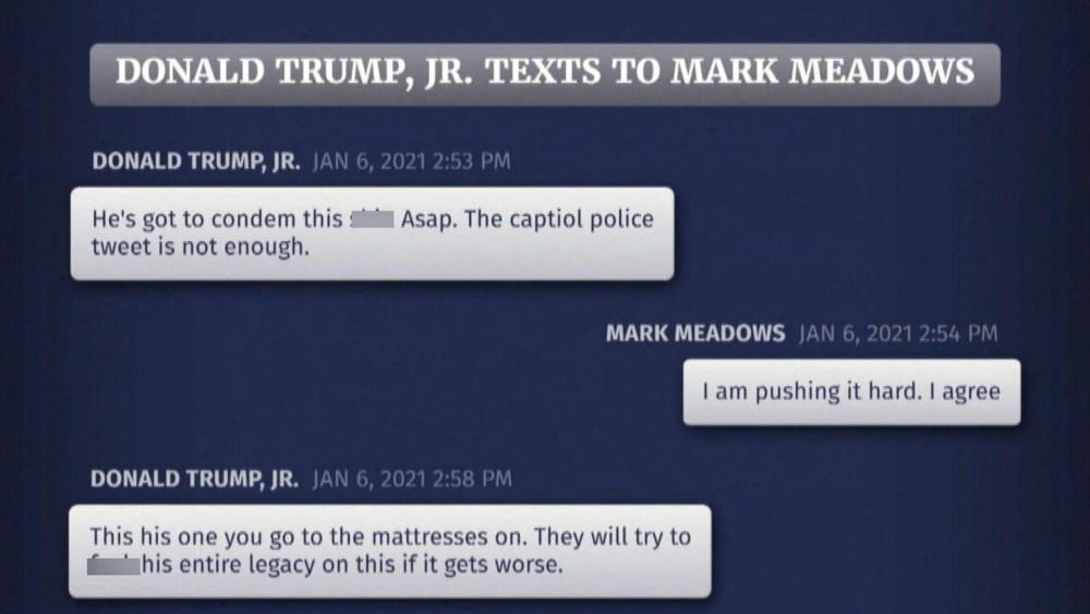 Committee shows Jan. 6 texts to Meadows from Don Jr, Fox News hosts