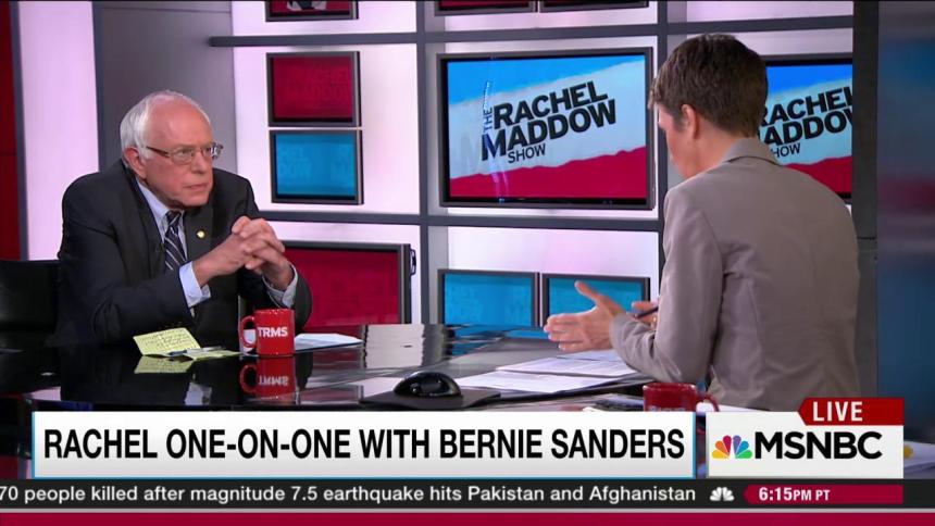 Sanders, who as a House member in ’96 was among the few lawmakers who voted against DOMA, is now hammering Hillary Clinton for her statement, arguing that the idea of a constitutional amendment prohibiting gay marriage wasn’t on the radar back then. At last weekend’s Jefferson-Jackson Dinner in Iowa, he suggested that she’s “trying to rewrite history,” and in his own appearance on Maddow’s show Monday night he said, “[Y]ou can’t say that DOMA was passed in order to prevent something worse. That is just not the case.”