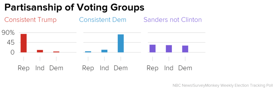 Demographically, voters who would support Sanders but not Clinton are mostly white (76 percent) and a majority (54 percent) are men. These voters are younger than the other voting groups—59 percent are under 45 years old. This follows a trend seen in NBC News Exit Poll results during the primary season; younger voters were more likely to vote for Sanders and older voters were more likely to vote for Clinton.