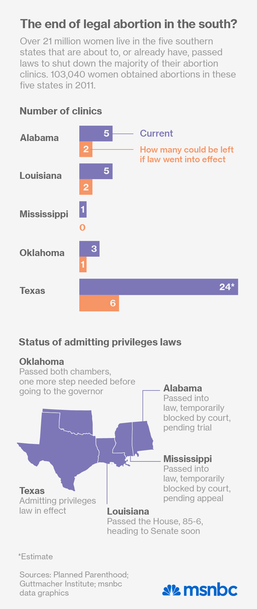According to Planned Parenthood, those laws would close three of five of Louisiana’s abortion clinics, including here in New Orleans, and two out of three of Oklahoma’s. In 2011, women in those five contiguous states – Mississippi, Alabama, Texas, Louisiana and Oklahoma – had a total of 103,040 legal abortions, according to the Guttmacher Institute.