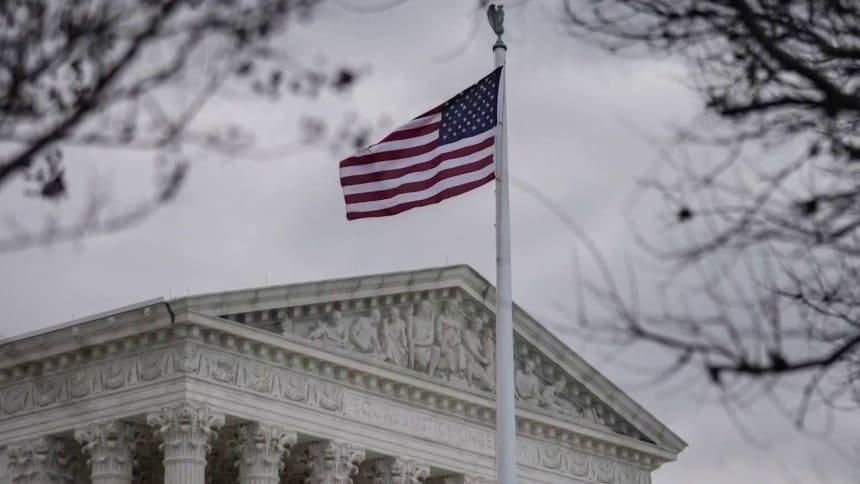 Photo illustration: Five pillars of the U.S. Supreme Court and the strip above are colored red and three pillars are blue.