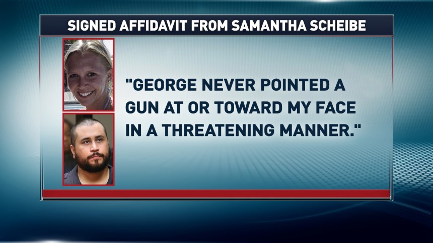 The announcement from the State Attorney’s Office comes after Zimmerman filed a signed affadavit from Scheibe which urged prosecutors to drop charges against him and recanted the allegations she made after the Nov. 18 incident, saying she believed she may have been “misinterpreted” by police and that she “may have misspoken about certain facts in my statement to the police.”